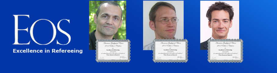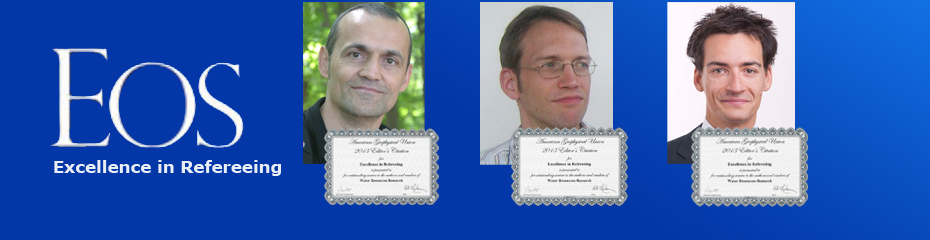04.06.2014: Each year, the American Geophysical Union (AGU) confers an award for "Excellence in Refereeing" for its published scientific journals. For the year 2013 this award was given to three GFZ scientists. Prof. Bruno Merz, Prof. Frederik Tilmann, and Dr. Daniel Farinott. The award was granted by the journals "Water Ressources Research" (B. Merz), "Geochemistry, Geophysics, Geosystems" (F. Tilmann), and "Journal of Geophysical Research - Earth Surface" (D. Farinotti) and is published in the latest edition of EOS (3 June 2014, Volume 95, Issue 22).