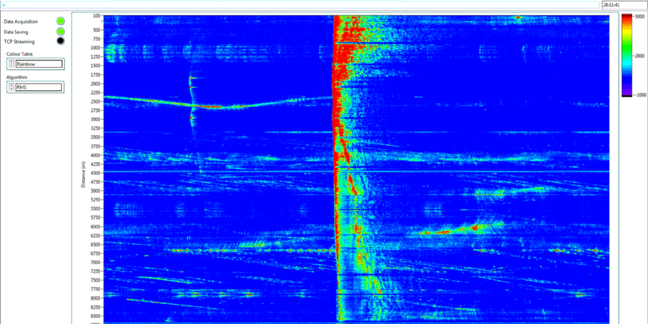 Forschenden des Deutschen GeoForschungsZentrums GFZ ist es erneut geglückt, seismische Signale einer Bombensprengung in Potsdam mit einer herkömmlichen Glasfaserleitung aufzuzeichnen. Die Sprengung fand am 15. Juli um 14.47 Uhr im Aradosee (Stadteil Teltower Vorstadt) statt. Die Forschenden nutzten eine Leitung eines Telekommunikationsanbieters, um das Signal in Echtzeit zu empfangen. Das Bild zeigt ein sehr starkes Signal über nahezu neun Kilometer Länge (rote Fläche in der Bildmitte von ganz oben nach unten).