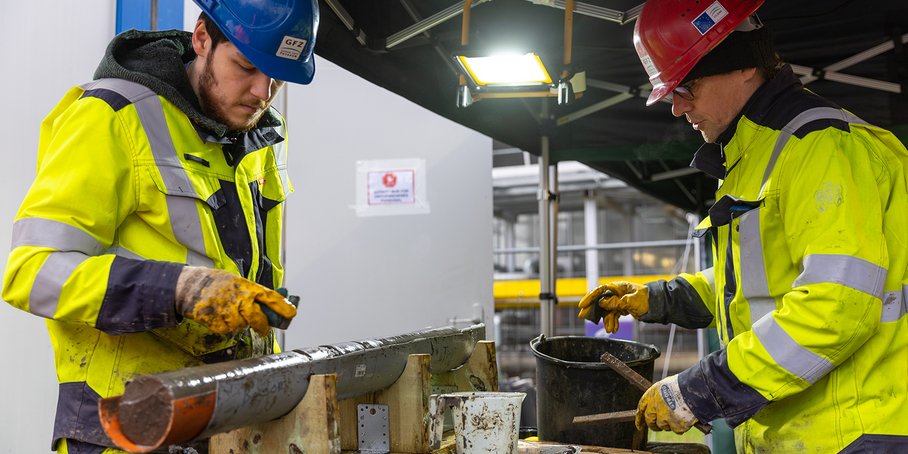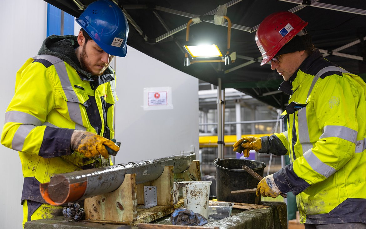 The exploratory drilling of the German Research Center for Geosciences in Berlin-Adlershof reached a depth of 300 meters on Monday, December 13. Numerous drill cores have already been obtained since drilling began in mid-November. The aim of the project, which is called “Geothermische Fernwärmeversorgung Berlin” GeoFern (Geothermal District Heating Supply Berlin), is to create the conditions for a climate-friendly district heating supply for Berlin with the help of a seasonal geothermal aquifer heat storage system. To this end, the underground must be examined in detail. Rock samples in the form of drill cores are brought up from the depths through drilling and then geologically characterized. The project partner is BTB Blockheizkraftwerks-Träger- und Betreibergesellschaft mbH Berlin, on whose premises the drilling is taking place.