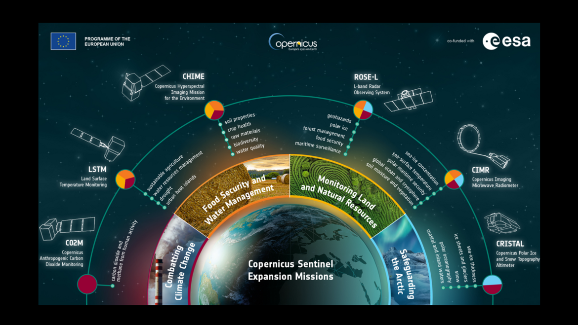 Future Copernicus missions and services (Fig. 1) will focus on better integrating stakeholder demand into planning and delivering products with better spatial and temporal resolution. Over the coming years, ESA will launch several Sentinel Expansion Missions, including the Copernicus Hyperspectral Imaging Mission for the Environment (CHIME), the Land Surface Temperature Monitoring (LSTM), and the Radar Observing System for Europe in L-band (ROSE-L). In the early 2030s, Sentinel-1 Next Generation and Sentinel-2 Next Generation (S2NG), which are currently still in the conceptual phase, will be in space. S2NG will offer a spatial resolution of 5–10 m and improved spectral and temporal resolution.