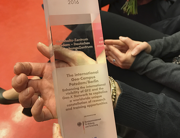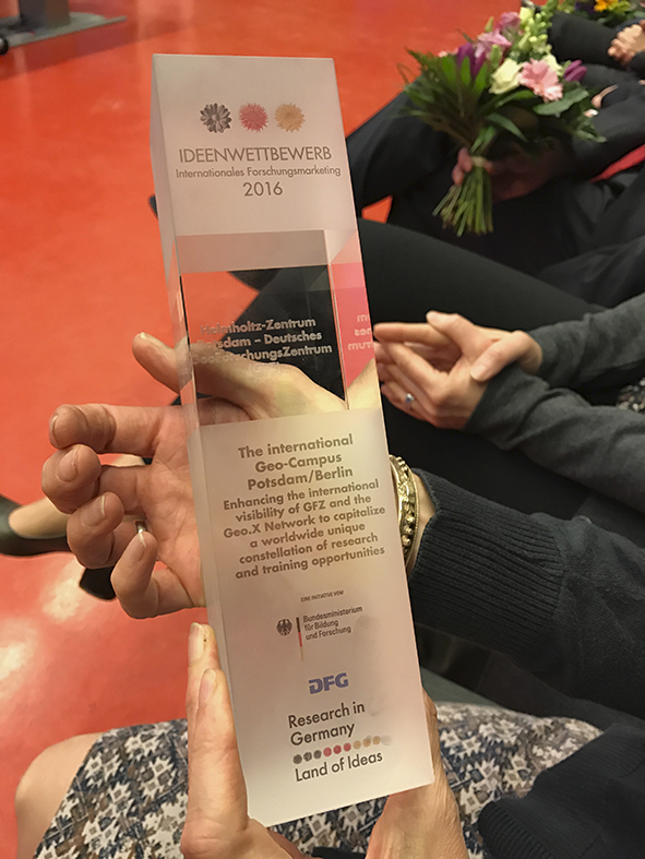 Das Helmholtz-Zentrum Potsdam – Deutsches GeoForschungsZentrum GFZ ist Preisträger des bundesweiten Ideenwettbewerbs „Internationales Forschungsmarketing“. Das vom Internationalen Büro des GFZ eingereichte Konzept "The international Geo-Campus Potsdam/Berlin – Enhancing the international visibility of GFZ and the Geo.X Network to capitalize a worldwide unique constellation of research and training opportunities" wurde von der Deutschen Forschungsgemeinschaft DFG mit 100.000 Euro prämiert. Am Donnerstag, dem 16. Februar 2017 wurde der in Potsdam übergeben.