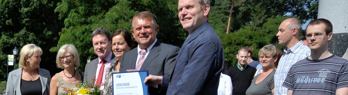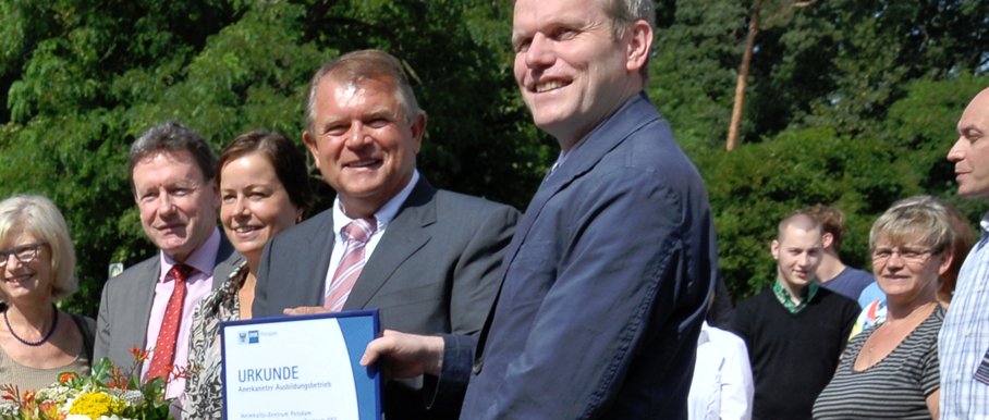 17.07.2013|Potsdam: As part of the "Brandenburg Training Consensus", the President of the Chamber of Industry and Commerce Potsdam (IHK), along with public figures, awarded the GFZ with the certificate "Approved Training Organization" today. Dr. Stefan Schwartze, the Administrative Executive Director of the GFZ, received the certificate from the IHK President Victor Stimming.
