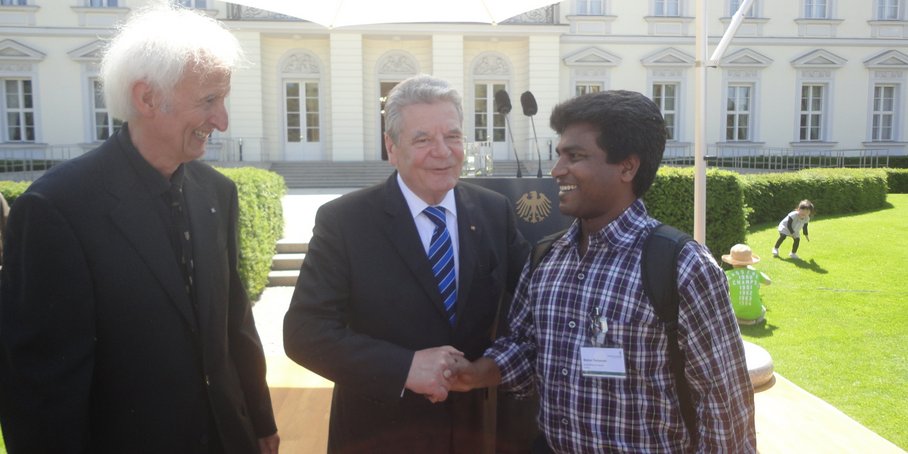 Dr. Helmut Schwarz (Präsident der Alexander von Humbodt Stiftung), Joachim Gauck (Bundespräsident) und unser Alexander-von-Humboldt-Fellow Waliur Rahaman (GFZ, Sektion 3.4 - Oberflächennahe Geochemie) [v.l.n.r.] beim Jahrestreffen der Alexander von Humboldt Stiftung im Garten des Schloss Bellevue in Berlin.