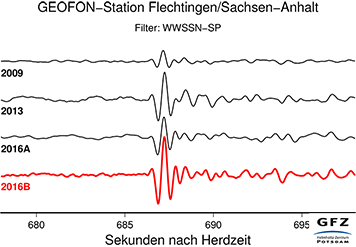 The graph shows the amplitude of seismic P-waves reaching Sachsen-Anhalt in Germany 11 minutes after the origin of the seismic shock in North Korea. P-waves are the fastest elastic waves (P stands for primary) caused by earthquakes. Compared to 2009, 2013, and 2016A, the current event (2016B) shows clearly the highest amplitudes. The amplitude of seismic waves emitted by underground explosions is mostly determined by the intensity of the initial shock but is also influenced by the depth of and the rock properties at the explosion site. (jz)