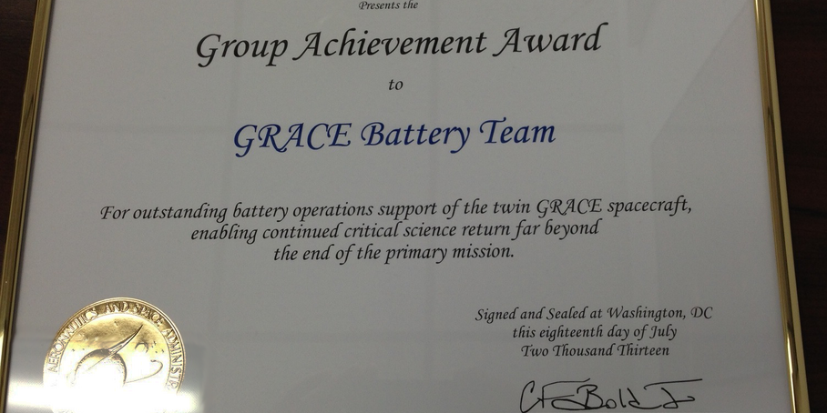 On July 18th 2013 the GRACE Battery Team was awarded for "Outstanding battery operations support of the twin GRACE spacecraft, enabling continued critical science return far beyond he end of the primary mission" by the National Aeronautics and Space Administration (NASA). As part of the team GFZ employee Franz-Heinrich Massmann receives this honor.