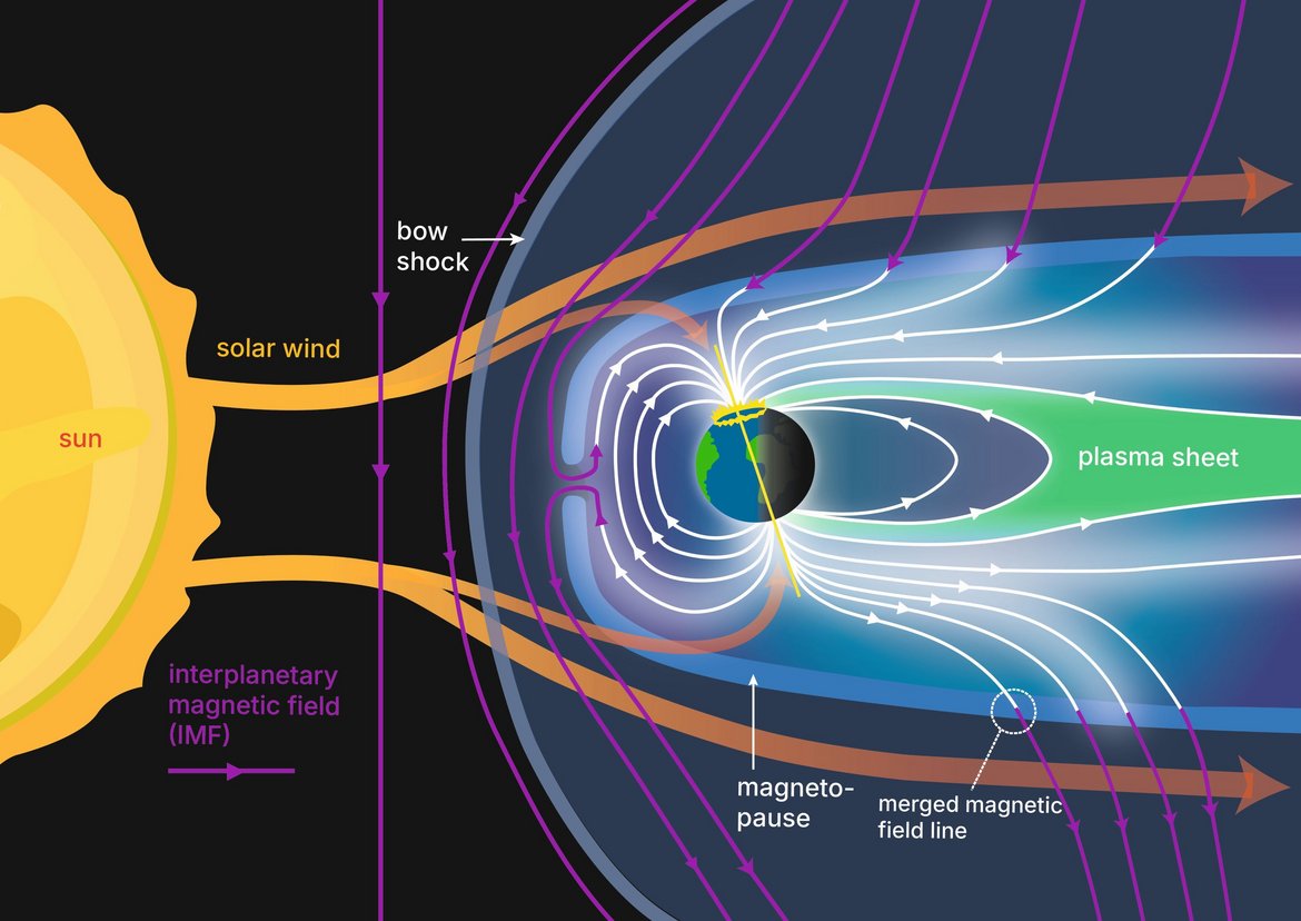 Formation of Auroras: Fast, charged particles from the sun‘s atmosphere collide with the magnetopause, the outer boundary of the magnetosphere. In the process, the solar wind deforms the Earth‘s magnetic field. On the side facing the sun, the solar wind compresses the Earth‘s magnetic field and on the side facing away from the sun, it pulls it apart to form a very long tail. The bow shock forms an arc-shaped front in front of the magnetopause, where the incoming solar wind particles are slowed down from supersonic to subsonic speed. (Note: The relative sizes of the Earth and the sun and the distances between the two bodies are not drawn to scale).