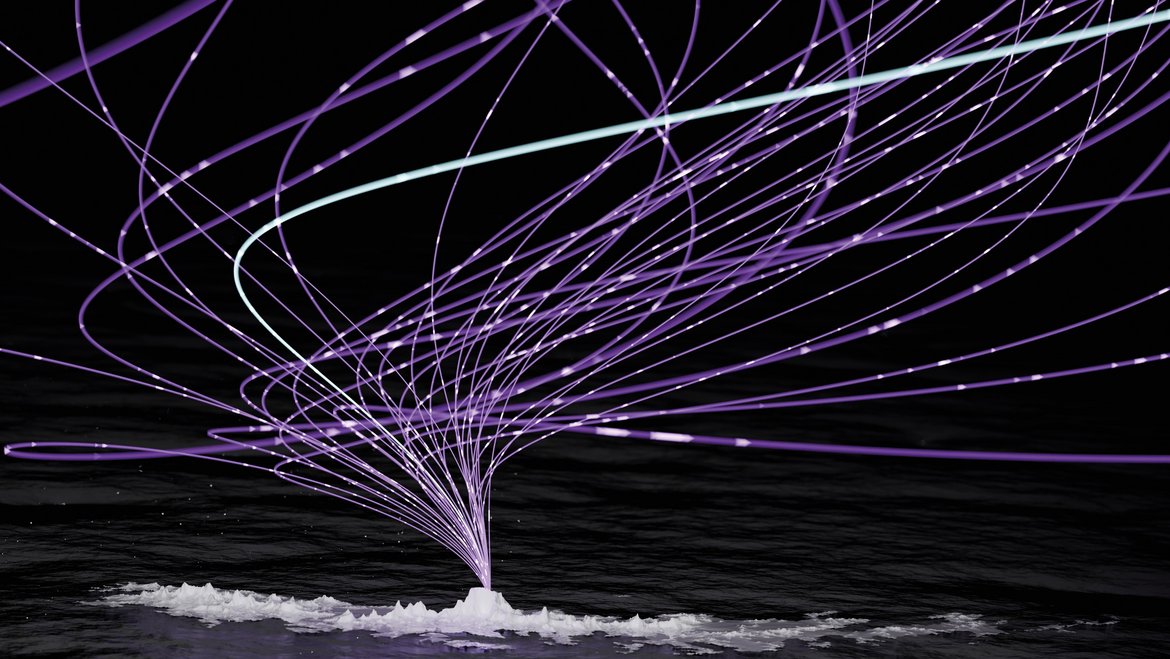 The image shows the trajectories of charged particles in the Earth's magnetic field above South Georgia Island (Spanish: Isla San Pedro) in the South Atlantic. The brightly coloured beam is based on currently measured data, while the purple lines show equally probable trajectories that we have modeled for a point in time 8,000 years ago.