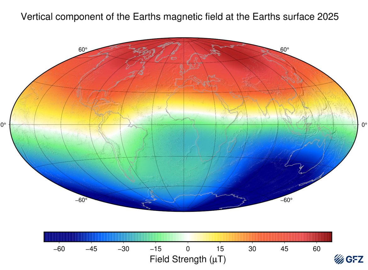 The core field also varies over time, a phenomenon known as secular variation. A comparison of data from 2015 and 2025 shows that the field strength has changed by up to 3.6% over the last 10 years (see figure below). It is obvious that the magnetic field does not change uniformly across the Earth. Although the strength of the dipole field is decreasing overall, there are some regions where the field strength is increasing. Currently, the Earth's magnetic field is tending to decrease in the western hemisphere and increase in the eastern hemisphere.