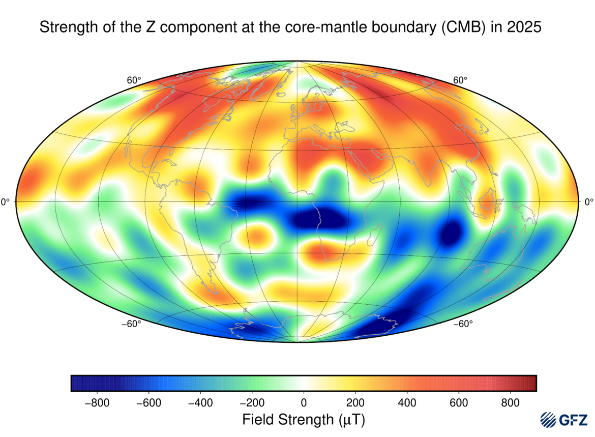 The field component used to probe the structure and dynamics of the Earth's core is the vertical component. Considering the mantle as an electrical insulator, the vertical component can be extrapolated to the core-mantle boundary, where its structure is more complicated than at the Earth's surface (see figure below). Distinct patches of reversed magnetic flux at the poles and below the South Atlantic region can be identified, which can be related to the present day field decrease. The most prominent feature in this respect is the growing patch of reverse magnetic polarity beneath the South Atlantic region.