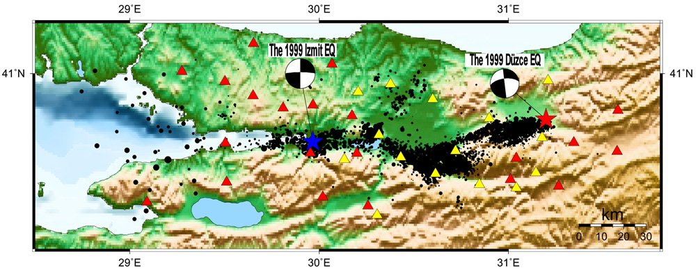 Spatial and temporal clustering of 10066 aftershocks are investigated along the 17 August 1999 Izmit (Mw = 7.4) earthquake rupture zone with a total length of 140 km. Based on the combined analysis of b- and p-values three asperities along the Izmit rupture of the North Anatolian Fault Zone are identified namely east of Sapanca Lake, west of Karadere-Düzce and east of Karadere-Düzce regions. Aftershock focal mechanisms are investigated along the eastern part of the 17 August 1999 Izmit earthquake (Mw = 7.4) rupture zone during the time window 22 August 1999 – 17 October 1999. The Karadere Fault reflects a combined strike-slip/normal faulting regime, the Düzce Basin that also has led the forthcoming Mw 7.2 mainshock 87 days later shows NE-SW extensional normal faulting.