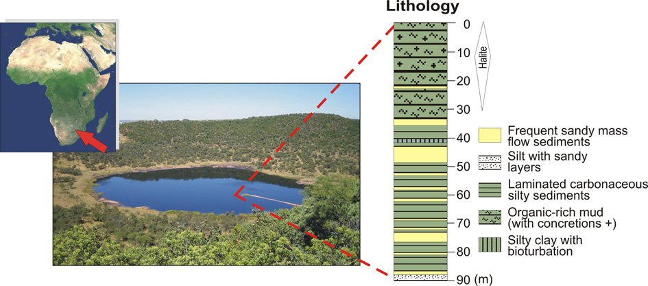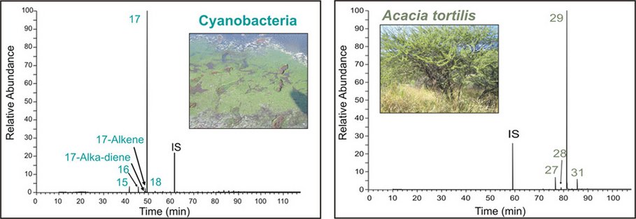 The biomarker characteristics and their specific δ13C signal from the present-day lake-water body and the adjacent vegetation are used for comparison to highlight environmental changes in the past as recorded in biomarkers of the sediments. Characteristics of typical organisms living today in the Tswaing crater ecosystem (e.g. higher-plants versus cyano-bacteria) are displayed in Figure 2.