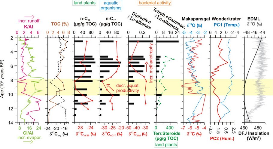 The relative abundance and δ13C-ratios of selected biomarkers indicate several changes in the Tswaing crater ecosystem between ~14,000 to 2,000 yr BP (see figure 3): From ~14.000 to 13,000 years BP (end of Termination I) and at the beginning of the Holocene (~11,000 years BP), the lake water body was well ventilated, as indicated by reduced organic matter preservation. These periods reflect moist and possibly cooler conditions while in between and from ~10,000 and 8,000 yr BP the climate was dry and organic matter was preserved in a stagnant water column. In the earlier Holocene, arid conditions reduced grass and probably also macrophyte densities along the shore. As a follow-up the nutrient supply to the lake decreased and aquatic productivity was diminished. At the end of this arid period the aquatic productivity increased again and reached a maximum ~5,500 yr BP. Especially bacterial activity is growing after ~8,000 yr BP and methanotrophic micro-organisms become an important constituent of the bacterial lake community. We propose that during the more arid conditions of the earlier Holocene the ITCZ has shifted northward, an interpretation, which is corroborated by other African climate studies.