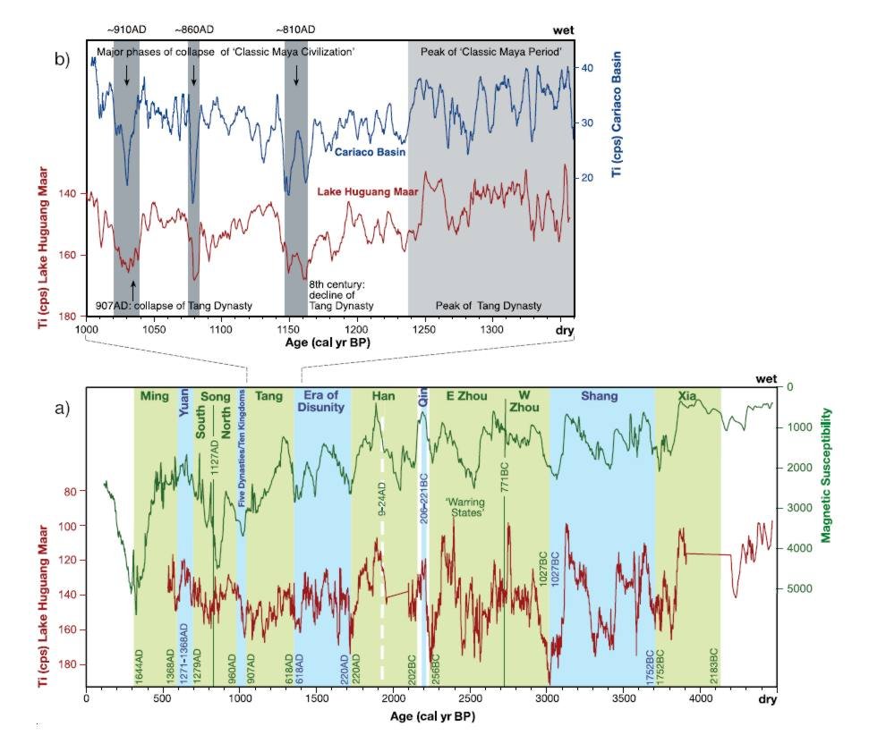 During the last Glacial, between 40,000 and 15,000 years BP, climatic conditions at the Huguangyan site were cool, dry, and rather stable, with no hints for strong millennial-scale cyclicity, at least in the presently available data set. During the Late Glacial, however, climatic variations recorded in the Huguangyan sediments show strong coincidence with other regional and northern hemispheric records like Hulu cave, marine records from e.g. the Cariaco Basin, and Greenland ice cores. For the last 4500 years high-resolution µ-XRF element scans as well as redox-parameters, explained as winter monsoon proxy for Lake Huguangyan, exhibit surprisingly large coincidence with precipitation proxy (Titanium content) from Cariaco Basin. Moreover, some dynastic changes of the Chinese history seem to be in time with abrupt changes of classical Maya cultures in Central America. Mechanistically this could be explained by migrations of the intertropical convergence zone (ITCZ) at both sides of the Pacific. Ongoing studies of deeper parts of the record will evaluate if this relation holds for the last Glacial period, too.