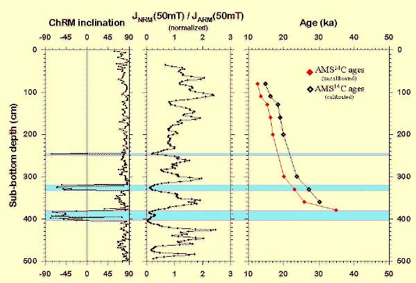 Arctic marine sediments turned out to ideal recorders of geomagnetic field variations such as short reversal excursions (Fig. 1; key publ.). Therefore, cores from the Svalbard region of the Arctic Ocean were chosen again for a further detailed analysis. The main objective of this project is to reveal the geomagnetic field behavior of excursions during the last about 100 ka with high temporal resolution based on magnetostratigraphic investigation of selected arctic marine sediment cores. High-quality directional and relative paleointensity data from different high-latitude sites shall contribute detailed full-vectorial information about the behavior of the geodynamo in space and time. Detailed rock magnetic as well as accompanying sedimentological and geochemical studies shall be performed in order to validate the quality of the obtained records. In addition, numerous absolute ages shall be derived with the accelerator mass spectrometry (AMS) 14C method in order to provide a detailed age model of the investigated sediments.