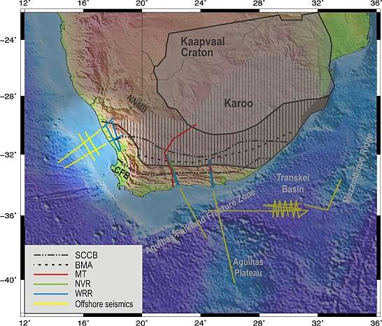 The western margin of southern Africa is a classic volcanic rifted margin, with associated flood basalts of the ~130 Ma Parana - Etendeka Province and with prominent seaward-dipping reflector sequences and high-velocity underplated crust offshore (e.g. Bauer et al., 2000).