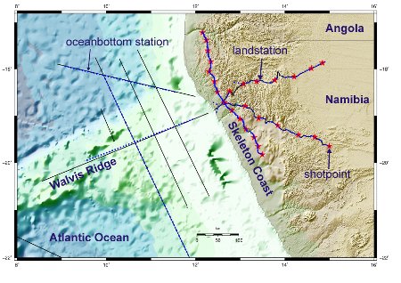 Passive continental margins offer the unique opportunity to study the processes involved in continental extension and break up and the role of hot-spot related magmatism. A combined on- and offshore seismic experiments was designed to characterize the Southern African passive margin at the location of the Walvis Ridge, to assess the interaction of the presumed plume with continental lithosphere and to determine the deep structure of the transition from the coastal fold belt to the stable craton, where the Walvis Ridge hits the African continent. The project integrates three experiments, (A) an onshore, coast-parallel refraction seismic profile, (B) two onshore-offshore wide-angle seismic transects, and (C) a combined on- and offshore seismic imaging of the sub-Moho velocity (Pn tomography) at the ocean-continent transition. The derived lithospheric structure of the margin together with results from other geoscientific studies (e.g., conducted within the SPP-SAMPLE) will help to address questions such as, how continental crust and plume head interact, what the extent and volumes of magmatic underplating is, and how and which inherited (continental) structures might have been involved and utilized in the break up process.