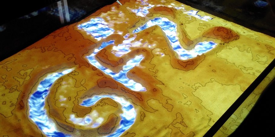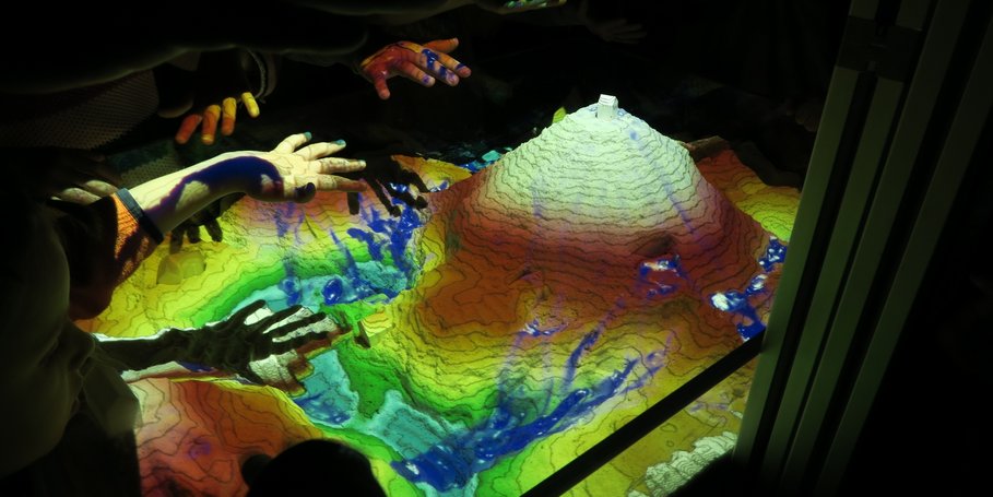 The Augmented Reality (AR) Sandbox is used for educative and interactive demonstration of natural processes and research questions in geophysics. The exhibit imparts knowledge particularly in fields of geomorphology and hydrology. The real analogue landscape of sand can be shaped at will. Simultaneously, the sand surface is scanned and the elevation model is projected back in real time. In addition to this elevation information the reality is augmented with water simulations. Thus rain, runoff, river routing and floods as well as dike breaks or dam failure could be shown in an impressive manner.
