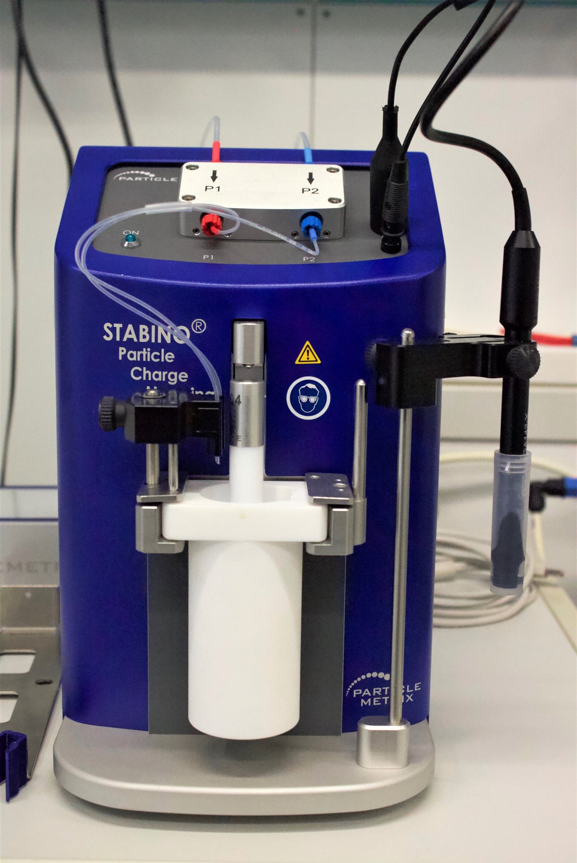 This instrument measures the size and ζ-potential of suspended particles, with an error of 2%. The volume of the measuring cell is 10 mL and the detected size range is between 0.3 nm - 300 μm. The addition of titrants is possible and controlled via two tanks by delivering solutions to the suspension.