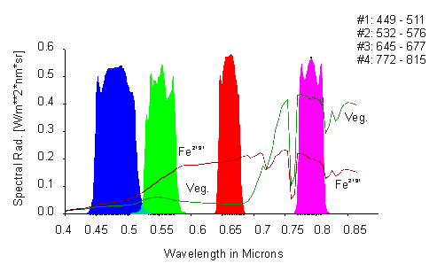 The spectral bands of MOMS-02 have been newly designed at wavelengths in the VIS/NIR range. Narrow widths and optimized centers of bands have been calculated on the basis of spectral characteristics of vegetation and Fe2+/3+ bearing targets, including solar irradiation and atmospheric absorptions. Advantages result for: