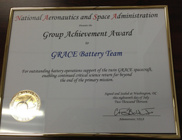 Am 18. Juli 2013 verlieh die National Aeronautics and Space Administration (NASA) dem GRACE Battery Team den Group Archievement Award für "Outstanding battery operations support of the twin GRACE spacecraft, enabling continued critical science return…