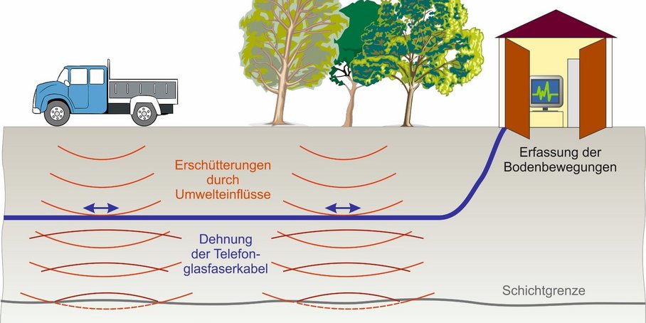 Glasfaserkabel werden als seismische Empfänger genutzt, um das seismische Wellenfeld mittels sogenannter ortsverteilter faseroptischer Dehnungsmessungen kontinuierlich aufzuzeichnen. Das Messverfahren erlaubt dabei die Aufzeichnung von Bodenbewegungen über eine Länge von bis zu mehreren 10er Kilometern mit einer räumlichen Auflösung von wenigen Metern bei Abtastraten von mehreren tausend Messwerten pro Sekunde an jedem Messpunkt. Das angeregte Vibrationssignal konnte am mobilen Kontrollbildschirm gut identifiziert werden. Das Ziel der Arbeiten ist die Entwicklung eines 3D geologischen Untergrundmodells (Potsdam3D), das die Basis für weitere Erkundungs- und Aufschlussaktivitäten liefert.