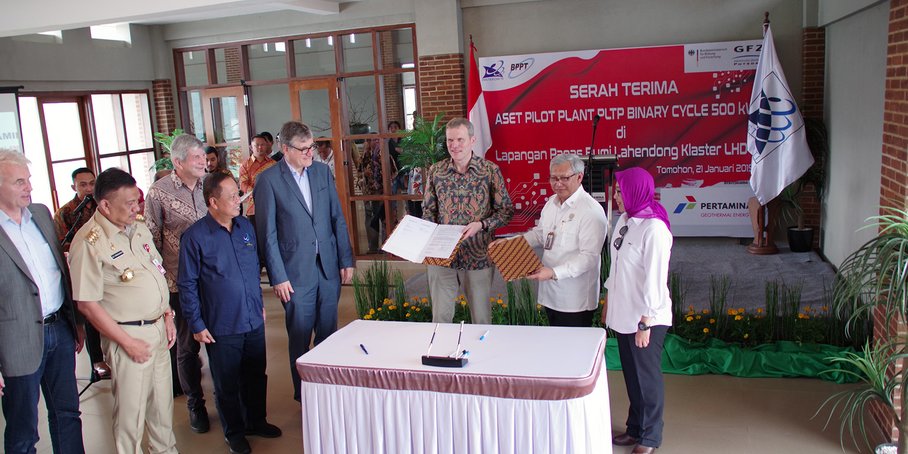 Niedertemperatur-Kraftwerke können erheblich zu einer effizienteren Nutzung der geothermischen Ressourcen in Indonesien beitragen. Sie eignen sich aufgrund der vergleichsweise geringen Baugrößen und der Möglichkeit zur automatischen Betriebsführung auch für die elektrische Versorgung netzferner Gebiete. Am heutigen Montag ist das vom Helmholtz-Zentrum Potsdam - Deutsches GeoForschungsZentrum GFZ in Nord-Sulawesi, Indonesien, errichtete geothermische Niedertemperatur-Demonstrationskraftwerk (GeNie) an das zukünftige indonesische Betreiberkonsortium übergeben worden. Bislang wird in Indonesien, abgesehen von der Demonstrationsanlage, nur an einem weiteren Geothermiestandort auf Niedertemperatur-Kraftwerkstechnik zurückgegriffen.