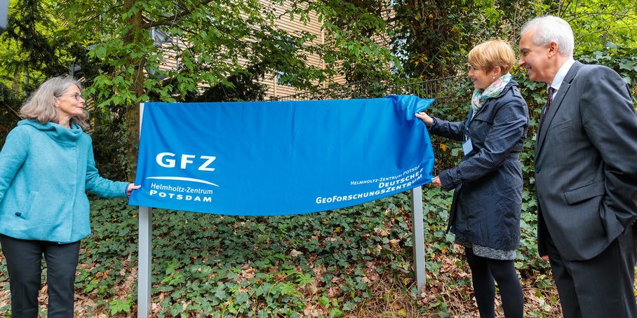 Charlotte Krawczyk, Martina Münch und Reinhard Hüttl bei der Enthüllung des Gebäudeschilds (Foto: Reinhardt & Sommer / GFZ).