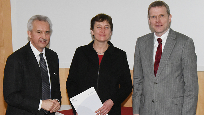 19.01.2016: Im Rahmen des heutigen Neujahrsempfangs am GFZ wurden herausragende Köpfe des vergangenen Jahres geehrt. Dr. Heidi Kreibich, GFZ-Sektion Hydrologie, wurde mit dem GFZ-Forschungspreis für Senior Scientists ausgezeichnet, den die beiden Vorstände, Prof. Hüttl und Dr. Schwarzte, überreichten.