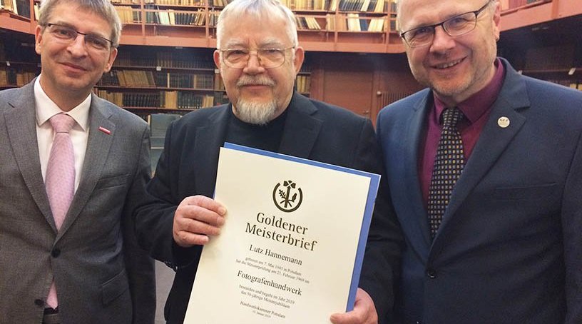 Lutz Hannemann, ehemaliger GFZ-Fotograf, nahm am vergangenen Donnerstag vom Hauptgeschäftsführer der Handwerkskammer Potsdam, Ralph Bührig, auf dem Telegrafenberg seinen Goldenen Meisterbrief entgegen. Genau auf den Tag vor 50 Jahren hatte er hier seine Meisterprüfung bestanden.