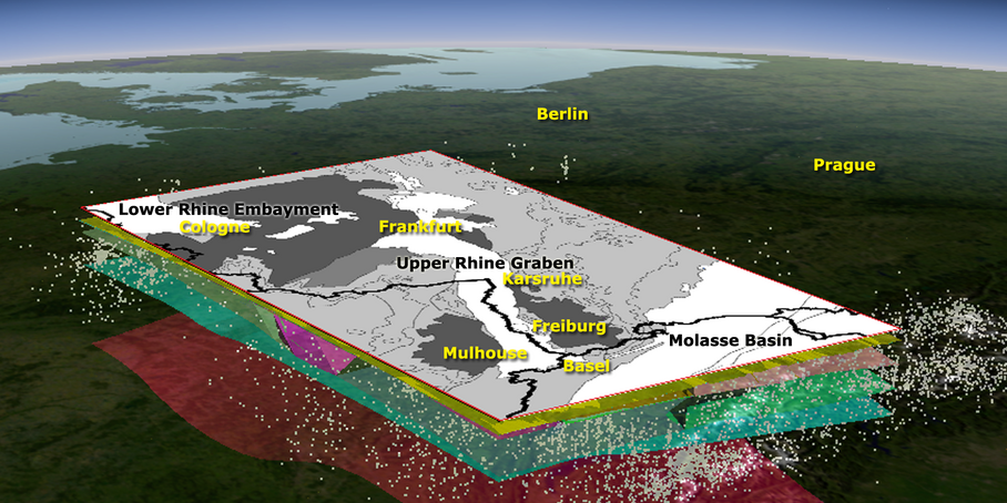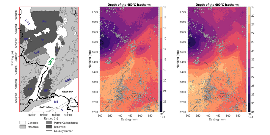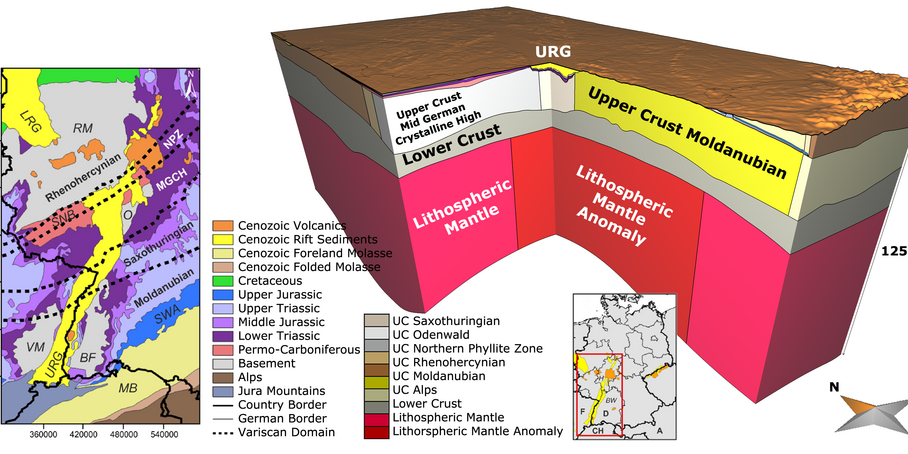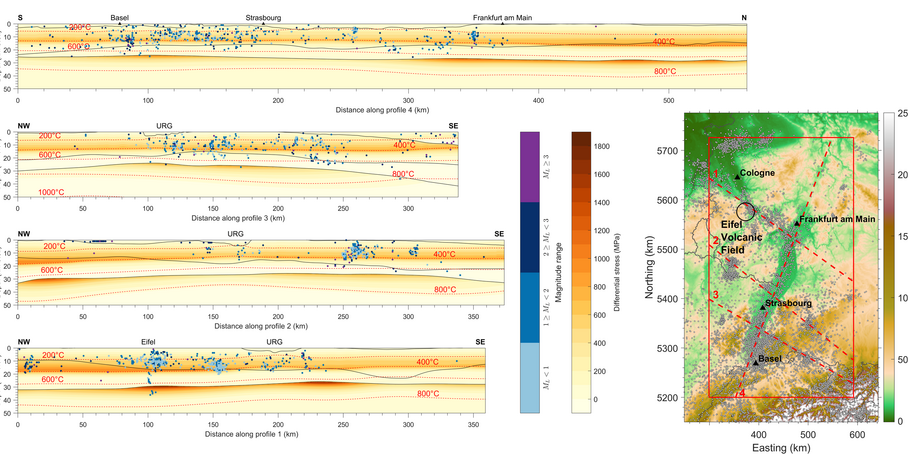 Der Rheingraben ist eines der seismisch aktivsten Gebiete Deutschlands und gleichzeitig ein Explorationsgebiet für geothermische Energiegewinnung. Obwohl bereits viele Studien den Versuch unternommen haben, das geothermische Potential zu quantifizieren, fehlt bislang eine Untersuchung, wie die mechanische Stabilität des Grabens mit der natürlich auftretenden Seismizität zusammenhängt. Dieser Frage geht eine Studie von Anikiev et al. nach. Insbesondere wird untersucht, wie die Deformationseigenschaften der Lithosphäre im Rheingraben und umgebenden Gebieten räumlich variieren. Diese Eigenschaften variieren aufgrund der tektonisch bedingten Struktur, genau genommen mit der damit einhergehenden heterogenen Verteilung physikalischer Eigenschaften und daraus resultierender Temperaturvariationen. Mit dieser Studie wird nun untersucht, wie diese Variationen das mechanische Verhalten der Lithosphäre beeinflussen und ob es eine räumliche Korrelation zur Verteilung der beobachteten Seismizität gibt. Dazu wurde die thermo-mechanische Stabilität des Gebietes anhand eines detaillierten 3D Modells, das die geologische Struktur, das Temperaturfeld und die rheologischen Eigenschaften beschreibt, untersucht.