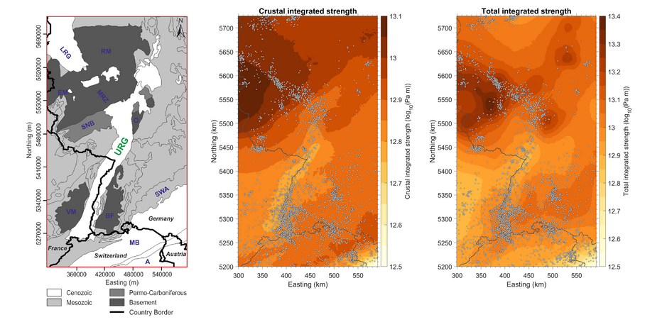 Vergleicht man die modellierte Verteilung der mechanischen Eigenschaften (Variationen der Rigidität) mit verfügbaren Erdbebenkatalogen, zeigt sich, dass die Seismizität im Oberrheingraben in geringerer Tiefe und mit kleineren Magnituden auftritt. Dies geht mit einer heißeren und damit weicheren Kruste im Bereich des Oberrheingrabens einher als in den angrenzenden Gebieten. Im Unterschied dazu wird im Gebiet östlich des Oberrheingrabens und in der Niederrheinischen Bucht seismische Energie in größeren Tiefen und mit höherer Intensität freigesetzt, was mit einer kälteren und rheologisch steiferen Kruste einhergeht. Diese Studie zeigt, dass die regionale 3D Charakteristik der Lithosphärenrheologie mit der räumlichen Verteilung von Seismizität zusammenhängt, was wiederum darauf hinweist, dass die mechanische Stabilität primär durch diese rheologischen Variationen bestimmt wird.
