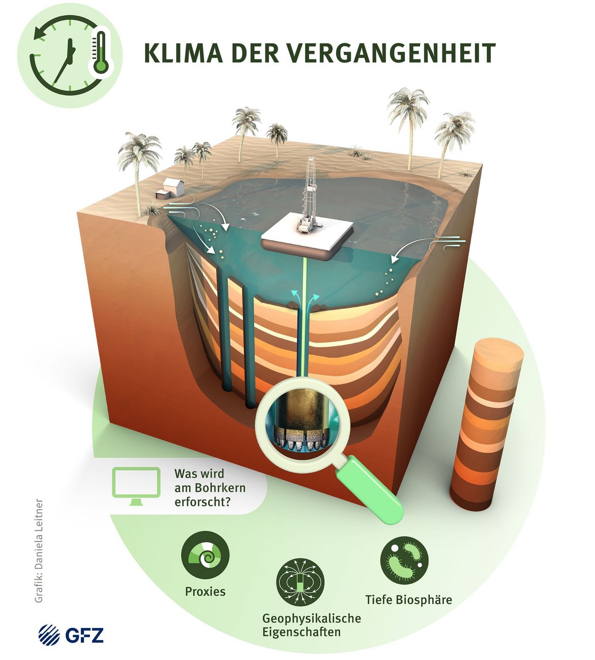 - Gewinnung von Erkenntnissen darüber, wie die vielfältigen Umwelt- und Klimaveränderungen in der Erdgeschichte ausgelöst oder wieder umgekehrt wurden und welche Treiber es in diesem komplexen System von Luft, Wasser, Kontinenten und Lebewesen gibt, um Vorhersagen für die Zukunft treffen zu können;