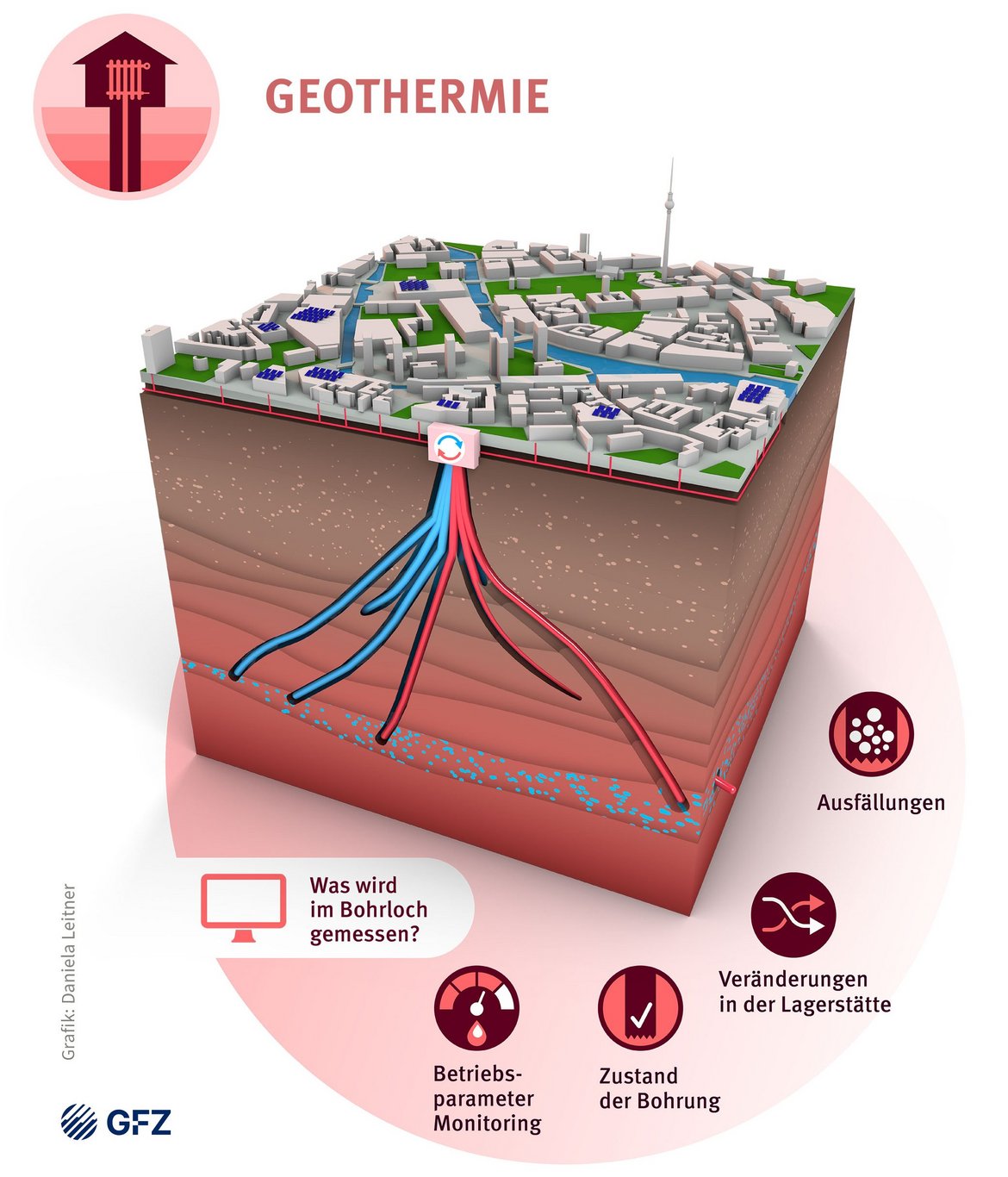 Zur Erkundung und Nutzung von geothermischer Energie wird seit einigen Jahren verstärkt im Süden Deutschlands, zum Beispiel im Münchener Raum und im Oberrheintalgraben, gebohrt. Dort ist das Potential, hohe Temperaturen von über 100 °C bereits in 3000 bis 5000 m Tiefe zu treffen, hoch. Die Gesteine weisen eine gute Durchlässigkeit auf, d.h., diese Reservoire dienen als gute, natürliche Wärmetauscher. Auch im Norden und Osten Deutschlands sind durchlässige Gesteine oftmals zwischen 1000 und 2000 m Tiefe vorhanden, aus denen sich 40 bis 70 °C warmes Wasser fördern lässt, um zum Beispiel moderne Niedrigtemperatur-Heizungsanlagen zu versorgen. Ganz in der Nähe des GFZ hat die Firma EWP in Potsdam im Winter 2022/2023 eine über 2000 m tiefe Bohrung an der Heinrich-Mann-Allee in Potsdam zur geothermischen Nutzung niedergebracht.