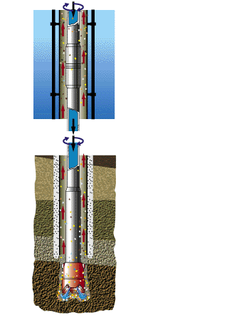 Um Tiefbohrungen abzuteufen, wird in einem speziellen Kran ein innen hohles Bohrgestänge mit einem Bohrmeißel verschraubt und in den Boden gesenkt. Eine Bohrspülung wird durch das Gestänge gepumpt und dreht mittels einer Bohrturbine den Meißel. Die Spülung kühlt den Meißel und trägt das so genannte Bohrklein außerhalb des Gestänges im Bohrloch nach oben. Mit diesem Verfahren kann man mehrere Kilometer tief in Gestein hineinbohren. Je nach Stabilität der Bohrlochwandung und Auftreten von Grund- und Tiefenwässern im Gestein wird ein Bohrloch abschnittsweise verrohrt und die „Rohrtour“ einzementiert, sodass ein nach unten abschnittsweise dünneres Bohrloch entsteht.
