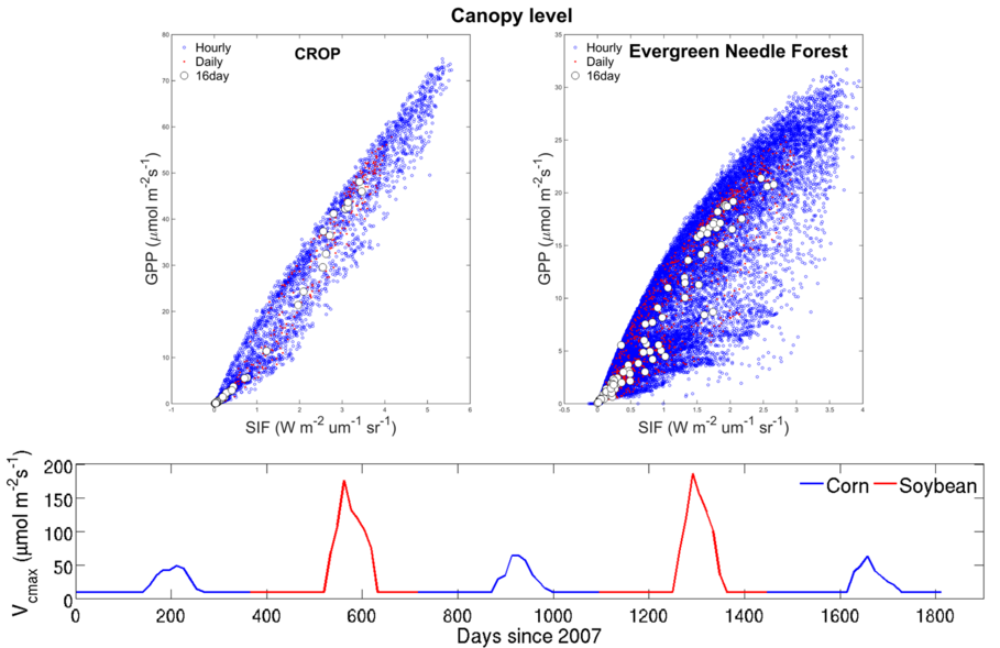 Even though fluorescence and photosynthesis are physiologically related, a number of external parameters such as the intensity of the illumination flux, air temperature or the structure of the canopy must be considered for a proper interpretation of the fluorescence data and their optimal exploitation as a proxy for GPP. Accounting for such factors in the exploitation of space-based fluorescence measurements involves the use of mechanistic models able to parameterize photosynthesis, fluorescence and existing driving factors in a systematic way.