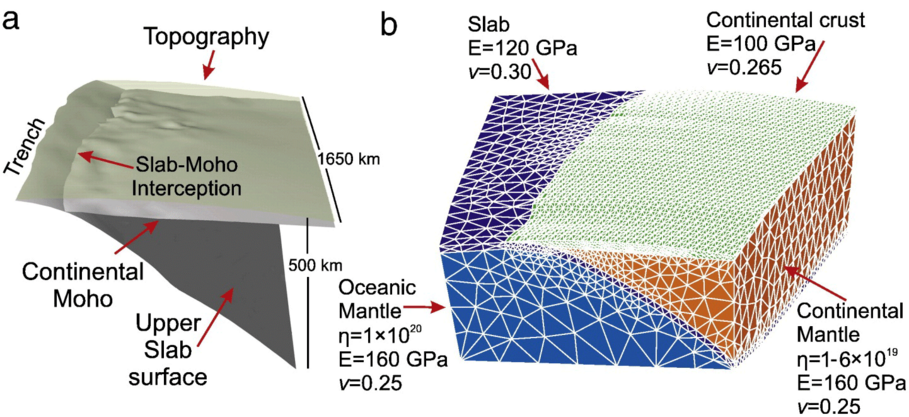 Configuration of 3-D FE-model of southern Andes a) FE-models include topography and bathymetry, as well as a precise geometry of the slab and continental Moho, which were derived from combining available geophysical information. b) The model structure consists of an elastic upper plate, an elastic subducting plate, a viscoelastic continental mantle, and a viscoelastic oceanic mantle.