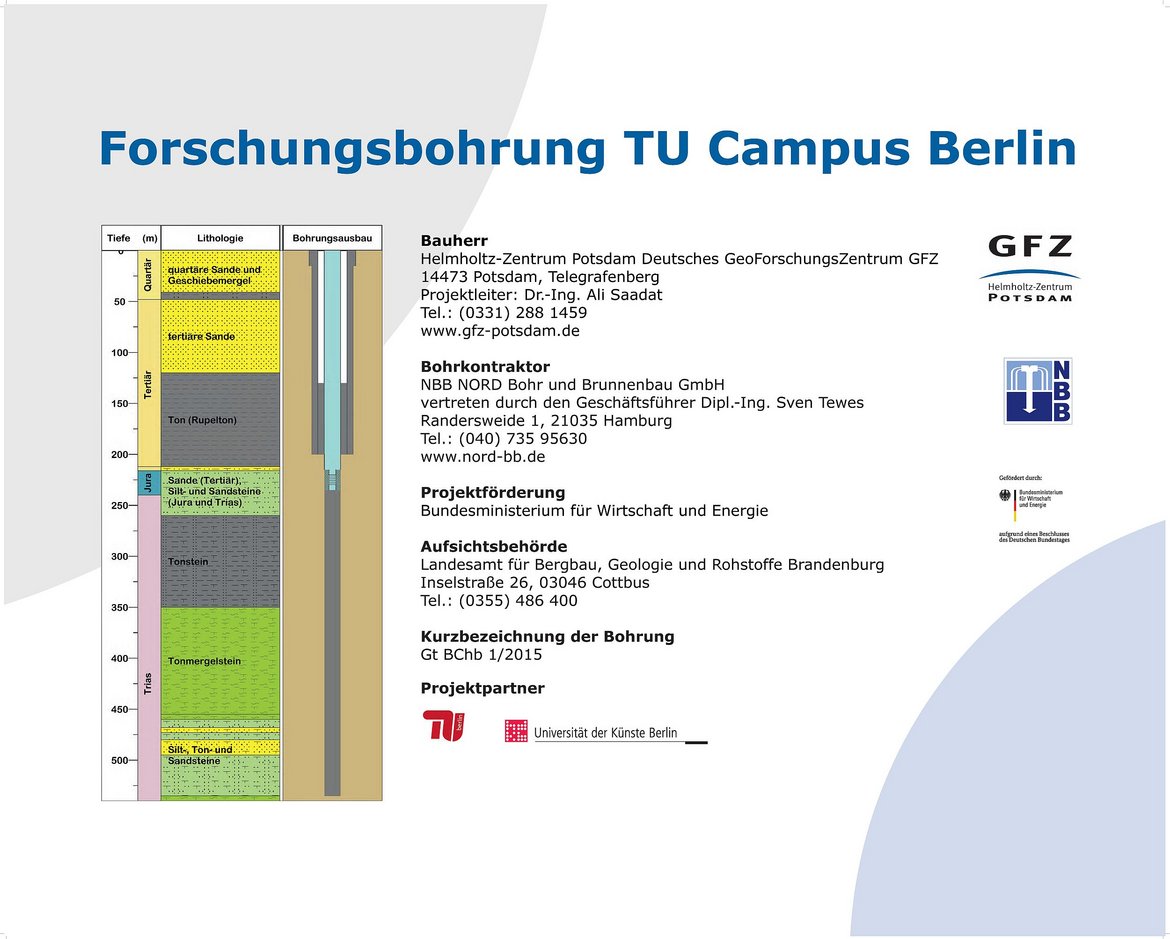 Bohrungen liefern der Wissenschaft wertvolle Erkenntnisse über die geologische Beschaffenheit des Untergrundes. Für den Berliner Untergrund stehen bisher nur wenige durch Bohrungen belegte Daten zur Verfügung. Eine Forschungsbohrung auf dem Campus Charlottenburg der Technischen Universität Berlin soll das geologische Verständnis über den Berliner Untergrund verbessern und der Fallstudie des ATES-Projektes zum Hochschulcampus TU Berlin / UdK Berlin eine verlässliche Datenbasis geben.
