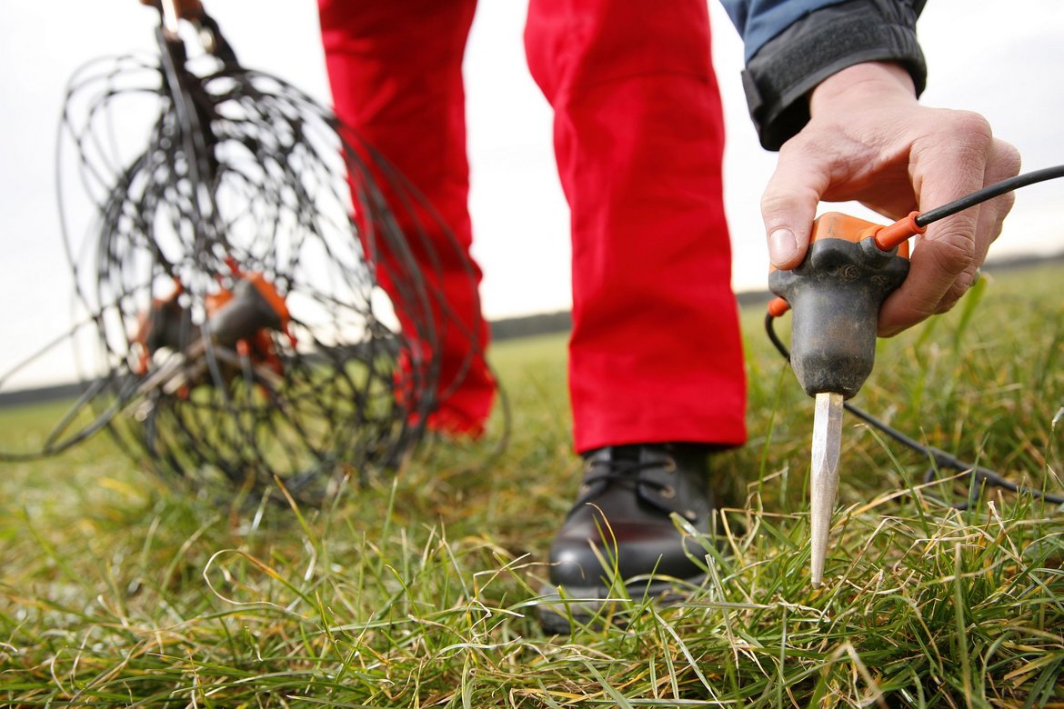 Geophone registrieren die Schallwellen an der Oberfläche und leiten sie über Kabel an den zentralen Messwagen weiter. (© DMT/Geisler)