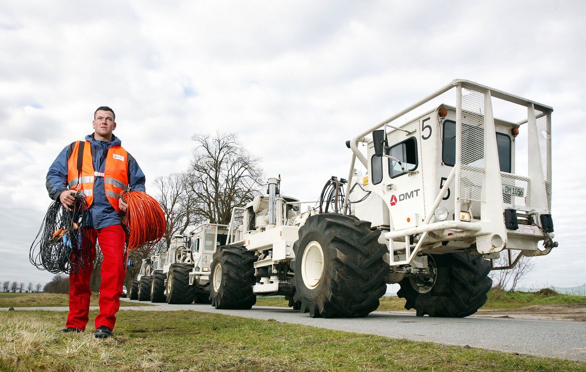 Vibrationsfahrzeuge vom Typ Mertz Hemi M12 fahren im Konvoi die Anregungslinien ab. (© DMT/Geisler)