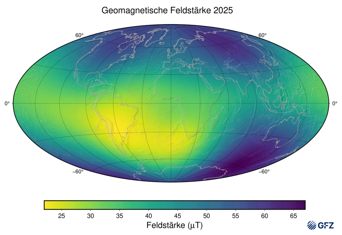 Gebräuchliche Einheiten zur Beschreibung des Erdmagnetfelds sind microTesla(µT=10-6T) und nanoTesla (nT=10-9T), wobei Tesla eigentlich die Einheit der magnetischen Flussdichte ist. Jedes Ergebnis der Messung des Erdmagnetfelds an irgendeinem Punkt und zu einer beliebigen Zeit enthält die Überlagung von verschieden starken Feldern unterschiedlichen Ursprungs: Kernfeld, Lithosphärenfeld, externe Felder (mit Ursprung außerhalb der Erde) und elektromagnetisch im Erdboden und den Ozeanen induzierte Felder. 1838 entwickelte C.F. Gauss mit der Kugelfunktionsanalyse eine Methode das Erdmagnetfeld global zu beschreiben und eine grobe Trennung von internen und externen Anteilen zu erreichen. Geomagnetische Feldmodelle die auf Kugelfunktionen basieren sind heute noch sehr gebräuchlich, aber wegen der Vielzahl unterschiedlicher Quellen ist eine strikte Trennung der verschiedenen Anteile bis heute nicht möglich. Die folgende Abbildung zeigt eine Karte der Feldstärkeverteilung aus einem solchen Modell des Kernfelds, welches aus Daten der CHAMP und Swarm-Satelliten und von geomagnetischen Observatorien am Erdboden berechnet wurde. Eine interessante Besonderheit des Kernfelds ist die sogenannte Südatlantische Anomalie. Dies ist ein großes Gebiet über Südamerika, dem Südatlantik und dem südlichen Afrika mit ungewöhnlich niedriger Feldintensität (weniger als 20µT).