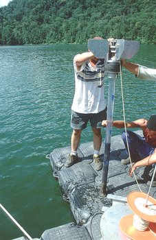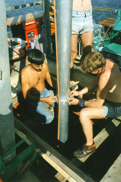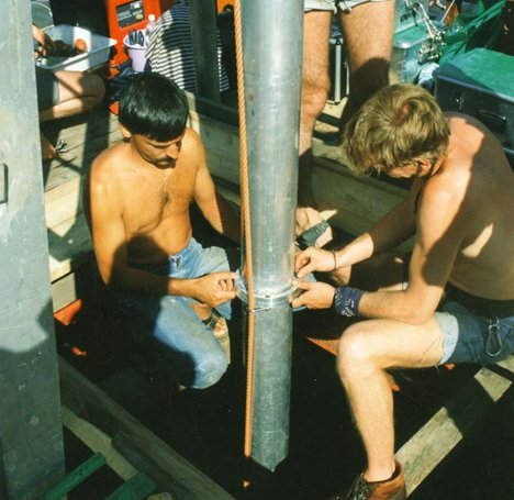 - das gesamte Bohrsystem wird durch eine Außenverrohrung aus Aluminium von der Plattform aus bis zur Sedimentoberfläche am Seeboden geführt