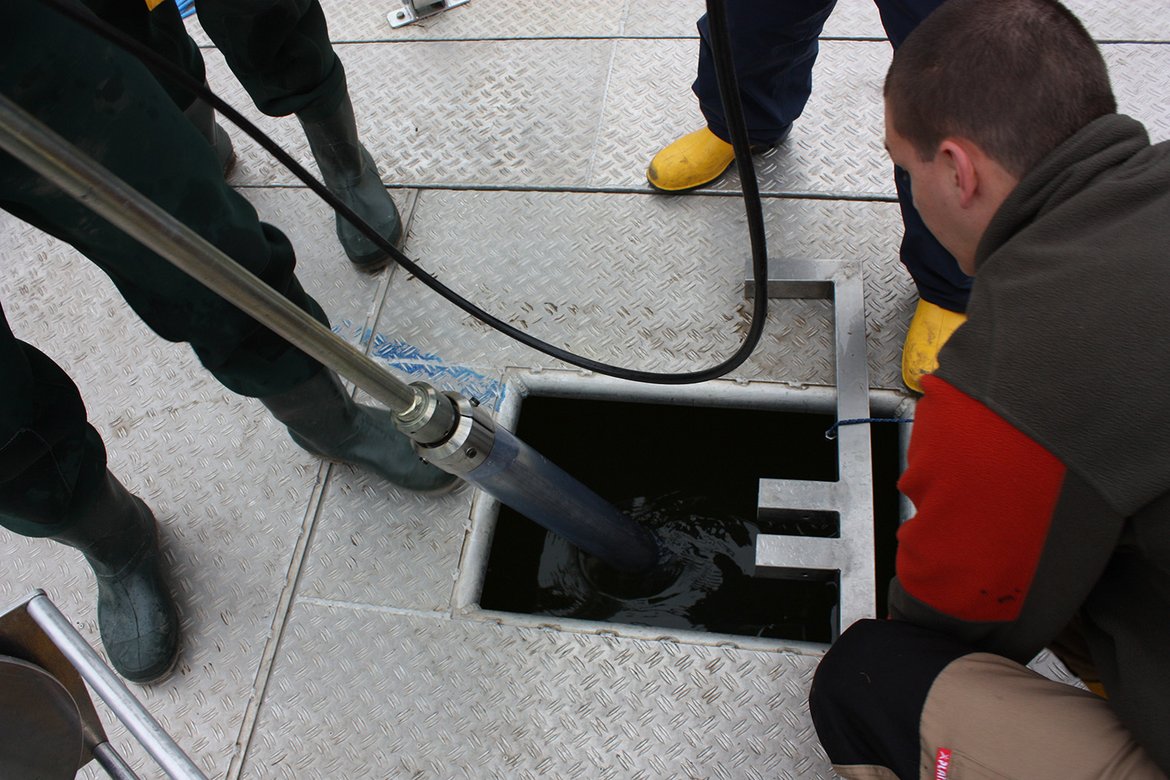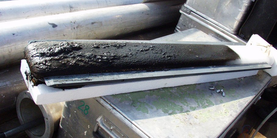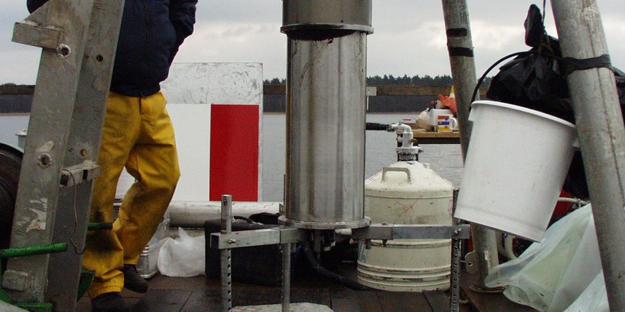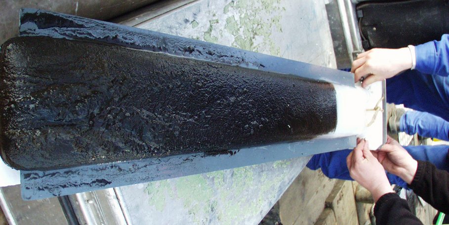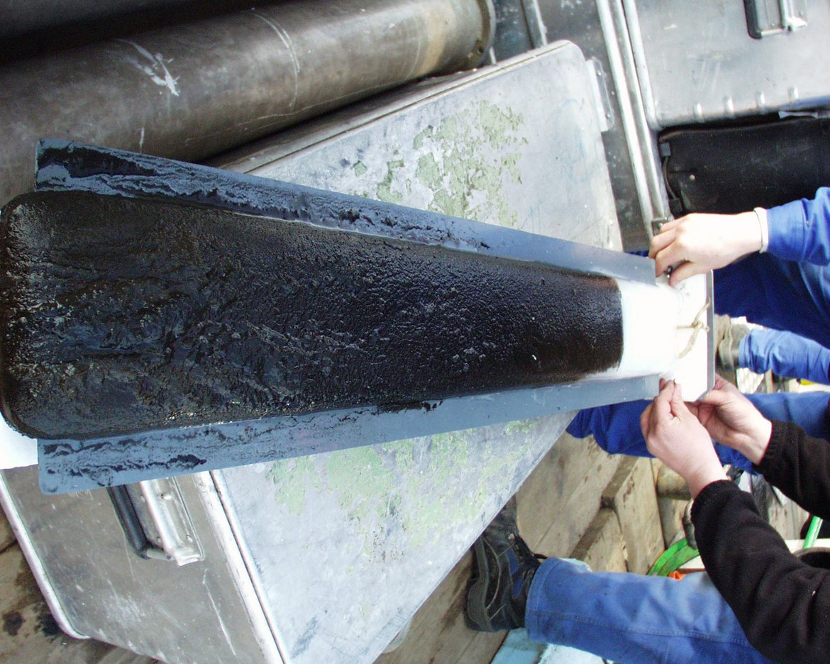 - zur Gewinnung unverfestigter, oberflächennaher Seesedimente; ein Aluminiumschwert wird mit Ethanol heruntergekühlt