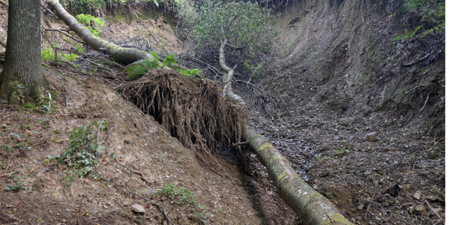 Extremer Regen am 14. Juli 2021 hat in mehreren Einzugsgebieten der Eifel in Westdeutschland schwere Überschwemmungen verursacht. Die Flut hat jedoch nicht nur schnell steigende Wasserstände und heftig fließende Bäche verursacht, es wurden auch riesige Mengen an Gehölz, Sedimenten und Schutt mobilisiert. Dies führte häufig zu Verklausungen (Verstopfung der Flüsse durch das mitgeführte Material) und damit zu nichtlinearen Fließdynamiken, Einschneidung von Hängen, Seiten- und Tiefenerosion bis zu ihren Quellbächen. Ebenso traten massiv gravitative Massenbewegungen wie Rutschungen und Murgänge auf.