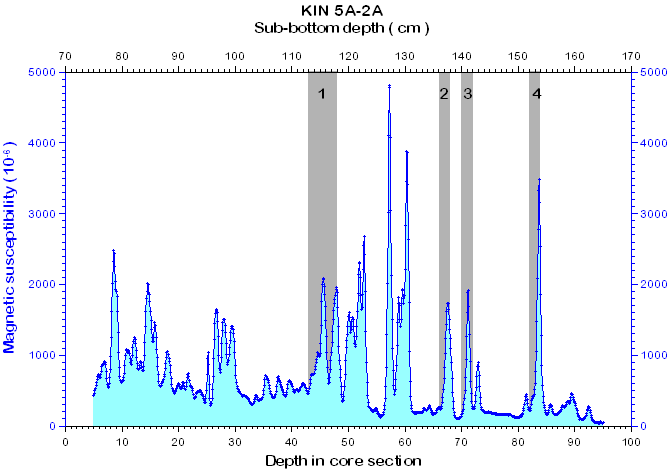 Altersbestimmungen mit Hilfe von AMS 14C ergaben, dass diese Sedimente den Zeitraum von etwa 20000 bis 40000 Jahren vor Heute repräsentieren. Sie erschienen somit als ideales Archiv, um die geomagnetische Paläosäkularvariation für diesen Zeitraum zu rekonstruieren. Die magnetostratigraphischen Analysen ergaben jedoch letztlich, dass die Sedimente massiv frühdiagenetisch überprägt sind. Das heißt, die ursprungliche detritische Magnetisierung, getragen von Eisen(titan)oxiden (Magnetit Fe3O4), ist weitgehend durch eine sekundäre Eisensulfidphase unbekannten Alters ersetzt worden. Neben unmagnetischem Pyrit (FeS2) ist vor allem der magnetische Greigit (Fe3S4) gefunden worden.