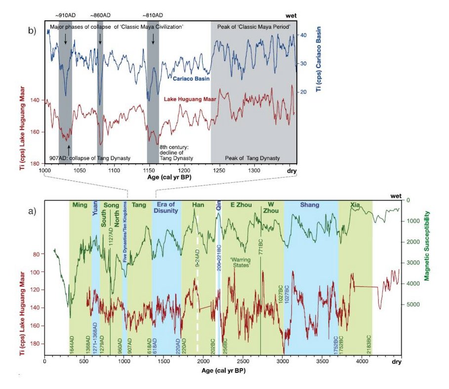 Höchstauflösende geochemische und gesteinsmagnetische Untersuchungen der Sedimente aus den vergangenen 4500 Jahren weisen ebenfalls deutliche Schwankungen des Wintermonsuns nach, die wiederum eine erstaunliche Übereinstimmung mit Variationen der innertropischen Konvergenzzone in Mittelamerika aufweisen. Auffallend ist das zeitliche Zusammenfallen von kurzen dekadischen Trockenphasen und verstärktem Wintermonsun mit Brüchen in der kulturellen Entwicklung Chinas, die einen kausalen Zusammenhang vermuten lassen.