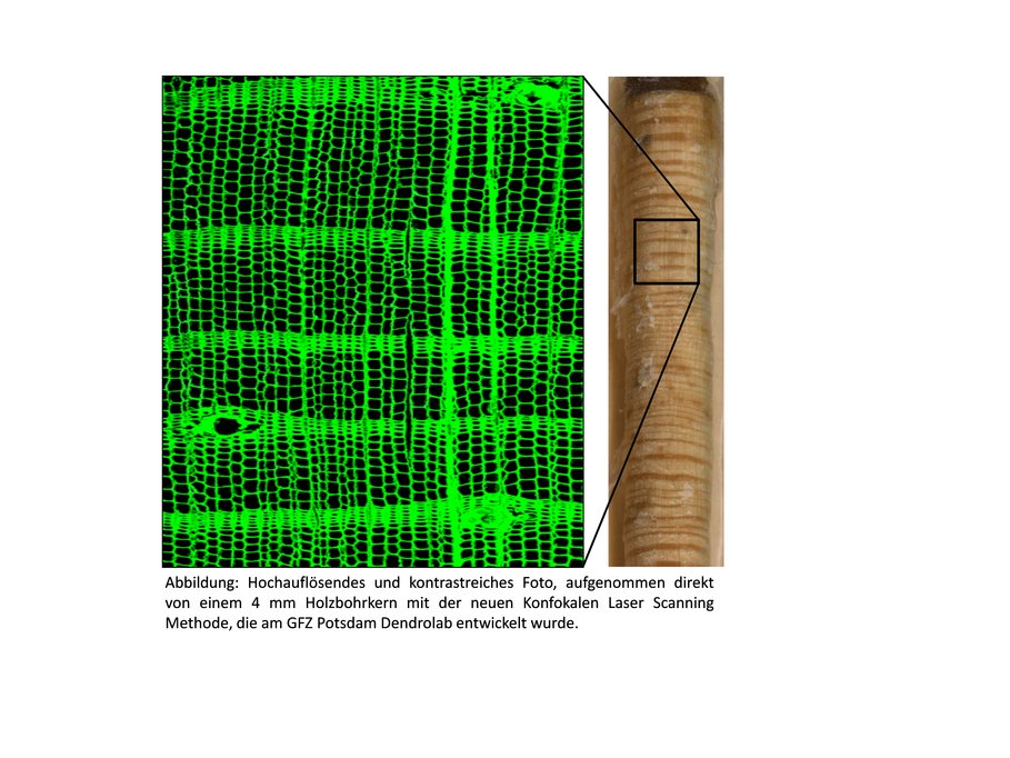 Deshalb ist im Sommer 2010 das Projekt "CLSM in der quantitativen Holzanatomie: ein neuer Methoden-Ansatz“, das vom China Scholarship Council und der deutschen Helmholtz-Gemeinschaft finanziert wird, am GFZ initiiert worden, um eine neuartige Anwendung der konfokalen Laser-Scanning-Mikroskopie zu entwickeln. Diese wird dann in der Lage sein mit weniger Aufwand direkt von Nadelholzoberflächen hochauflösende und kontrastreiche Fotos der Holzstrukturen zu liefern, die dann für die Herstellung langer und genauer Chronologien genutzt werden.