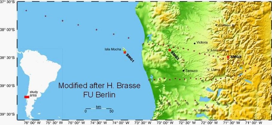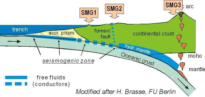 Ziel des passiven elektromagnetischen Experiments mit einer Kombination aus marinen und landbasierten Messungen ist es, Fluide in der abtauchenden Platte aufzuspüren und abzubilden. Fluide spielen eine entscheidende Rolle bei Subduktions- und Bruchvorgängen und wechselwirken mit tiefreichenden Verwerfungszonen im Forearc. MT Messungen erfordern ein dichtes Netzwerk von Messstationen an Land, um laterale Variationen der elektrischen Leitfähigkeitsstrukturen und den Nord-Süd-Trend der Bathymetrie zu erfassen. Die elektromagnetischen Experimente werden von der MT-Arbeitsgruppe der FU Berlin (H. Brasse) durchgeführt.