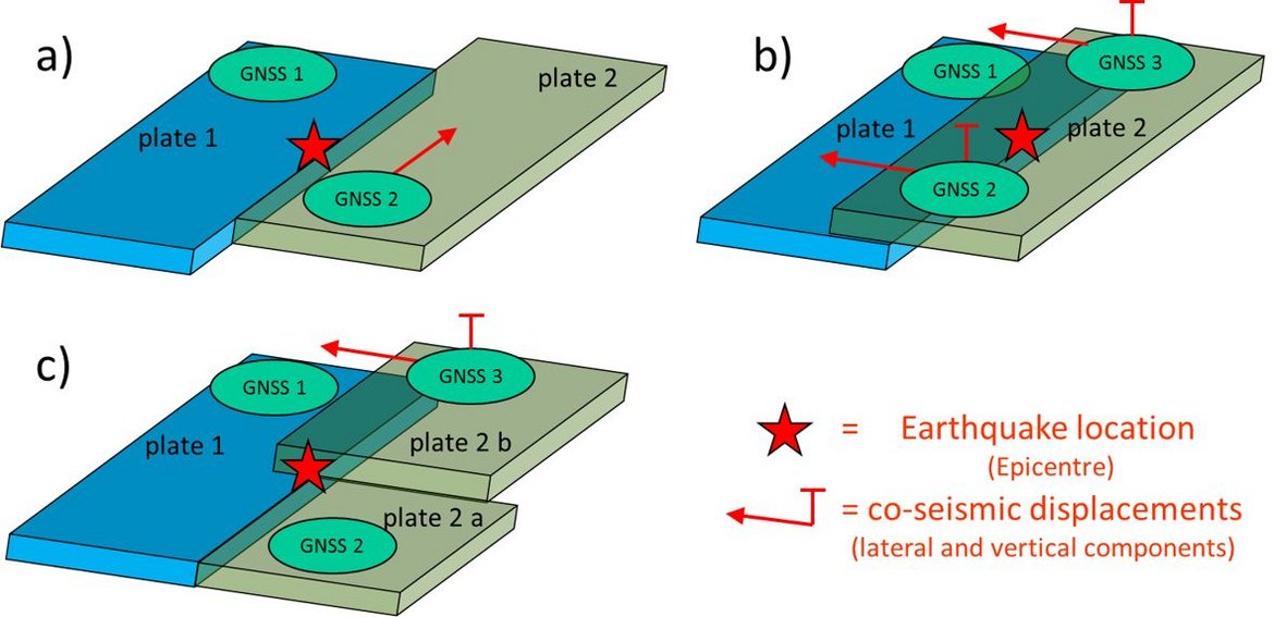 Die Stärke (Magnitude) und der Ort (Epizentrum + Tiefe) eines starken Erdbebens lassen sich mit der Messtechnik und den Methoden der Seismologie schnell und genau bestimmen. Wie und in welchem Ausmaß dabei die Erdoberfläche im Bereich des Erdbebens verformt (deformiert) wurde, kann mit Hilfe der Seismologie bisher nur abgeschätzt, aber nicht genau bestimmt werden. Für die in der Tsunami-Frühwarnung wichtige, schnelle Beantwortung der Frage, ob ein Erdbeben einen Tsunami ausgelöst hat, ist aber gerade die Kenntnis dieser ko-seismischen Deformationen besonders relevant. Hier helfen die GNSS-Messtechnik (GNSS-Stationen) und ein spezielles Auswertungssystem, mit denen Bodenbewegungen an der Erdoberfläche erkannt und genau bestimmt werden können. Die GNSS-basierte Bestimmung von Bodenbewegungen funktioniert besonders gut in der Nähe von Erdbebenherden, wo die Beträge der Bodenbewegungen hoch sind. Im Gegensatz dazu können seismologische Sensoren in der Nähe von Erdbebenherden übersteuert werden, während Messungen von weiter entfernten Sensoren, aufgrund der Laufzeit der seismischen Signale, erst nach einer gewissen Zeit zur Verfügung stehen können. Im Zusammenspiel mit anderen Techniken (Bestimmung des Tsunami auslösenden Mechanismus und der Bruchfläche) kann durch mit GNSS-Technologie bestimmte Messwerte von Bodenbewegungen die Zuverlässigkeit von Tsunami Frühwarnungen deutlich verbessert werden (Abbildung 1).