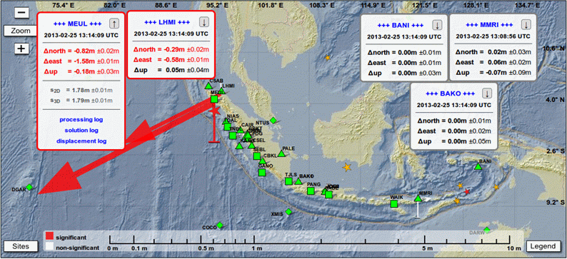 Im Rahmen des GITEWS-Projektes wurde am GFZ ein automatisch arbeitendes System zur Bestimmung von Bodenbewegungen bzw. ko-seismischer Deformationen entwickelt. Es stützt sich auf ein GNSS-Prozessierungssystem zur automatischen, nahe Echtzeit-Verarbeitung der an GNSS-Stationen in und um Indonesien kontinuierlich gemessenen Daten. Dieses am indonesischen Warnzentrum als Ground Tracking System eingeführte System kann weniger als 3 Minuten nach einem starken Erdbeben erste Werte (3D Versatzvektoren) für relevante, d.h. insbesondere erdbebennahe Standorte mit GNSS-Instrumenten liefern, die dann alle 2 Minuten aktualisiert werden (Abbildung 2).