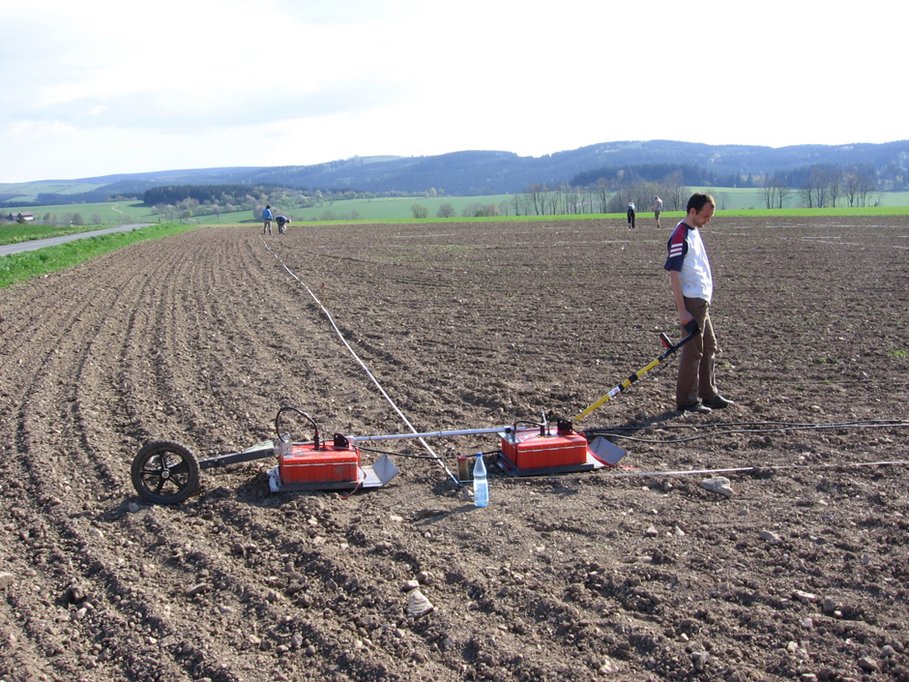 - Bestimmung des Bodenwassergehalts: Die Ausbreitungsgeschwindigkeit elektromagnetischer Wellen korreliert mit dem Bodenwassergehalt. In der obersten Bodenschicht kann sie mit der Bodenwelle bestimmt werden, welche innerhalb des Bodens entlang der Grenze zur Luft propagiert. Je nach Frequenz der Antennen können Unterschiede in der Bodenfeuchte mit einer lateralen Auflösung von wenigen cm kartiert werden.